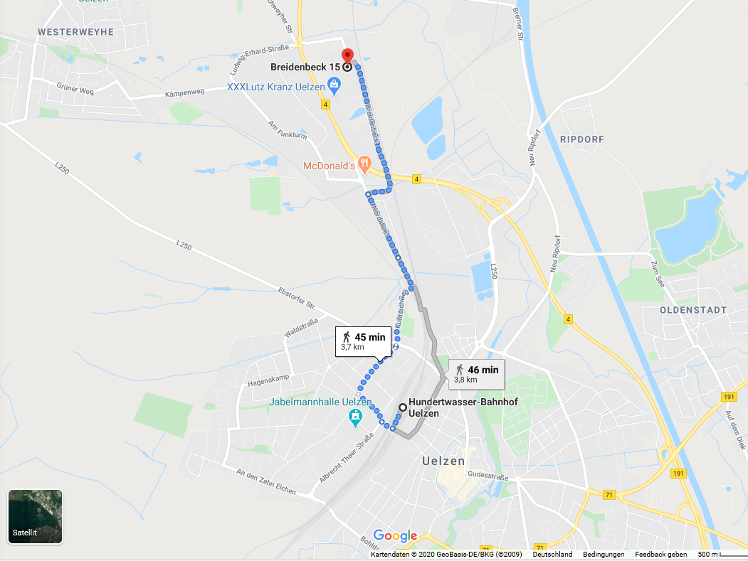 Kartenausschnitt Google-Maps mit dem eingezeichneten Fußweg vom Bahnhof Uelzen zur JVA Uelzen. (etwa 45 Minuten)